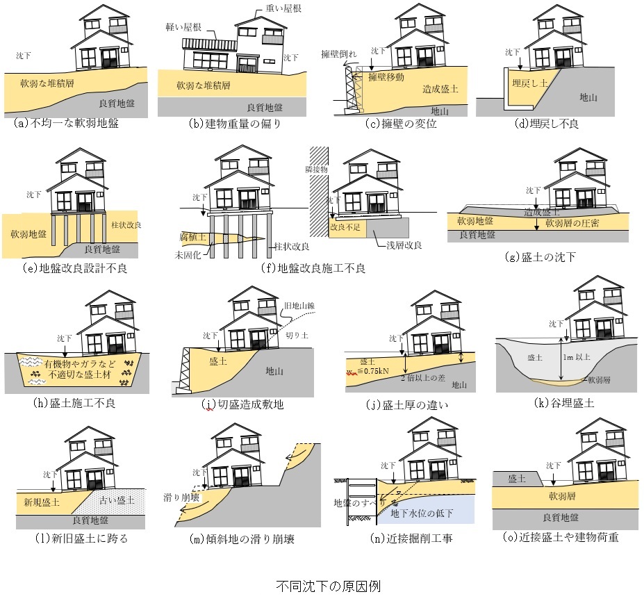 建築物の沈下にはここに示すように、(a)不均一な軟弱地盤(b)建物重量の偏り(c)擁壁の変位(d)埋戻し不良(e)地盤改良設計不良(f)地盤改良施工不良(g)盛土の沈下(h)盛土の施工不良(i)切盛造成敷地(j)盛土厚の違い(k)谷埋盛土(j)新旧盛土にまたがる(m)傾斜地の滑り崩壊(n)近接掘削工事(o)近接盛土や建物荷重 など様々な原因があります。
