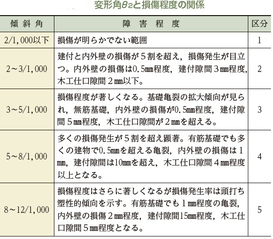 このように傾斜角による障害は、使用性や機能上の問題であり、通常生じる沈下では、建物の傾斜だけでは建物にひび割れ等の損傷が生じることはなく、構造的な問題は生じません。
