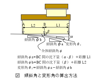 建物の沈下傾斜の測定は、基礎の天端を測定するのが理想ですが、実際に困難なので、基礎に近い堅固な床で測定し、傾斜角と変形角はこの図のようにして求めます。