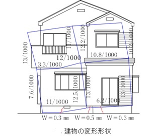 傾斜量が変化するということは、建物に変形(歪み)が生じていることです。ひび割れなどの損傷の程度は変形量(角)の大きさに比例しますので、変形角の大きさと損傷程度を比較することで、沈下以外の原因による損傷を排除して沈下被害の程度を把握することができます。