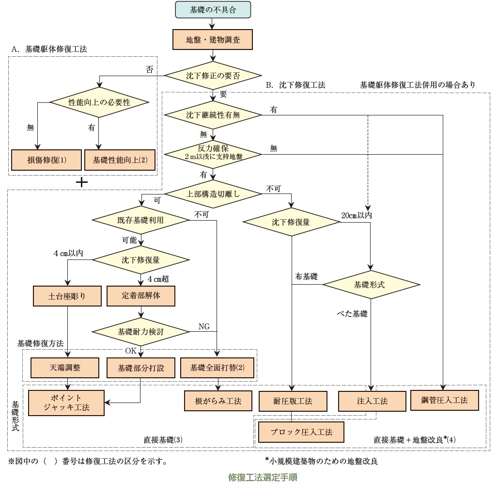 沈下被害では基礎の修復が重要となります。この図は、基礎の不具合事象別の発生原因と修復目的を示したものです。基礎の不具合は、ひび割れや欠損(以後,あわせて損傷と呼びます)と基礎の沈下に区分されますが、基礎が沈下したことにより損傷が生じるなど、実際の不具合事象は複合的な場合が多くあります。