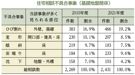 沈下被害は「住宅の品質確保等の法律」(2000年制定)や関係法令の制定、日本建築学会「小規模建築物基礎設計指針」(2008年)の発刊などにより、近年はこの表のように減少傾向にありますが、2000年以降に建築の建物でも、軟弱地盤地域での調査によれば1%程度の割合で発生しています※。