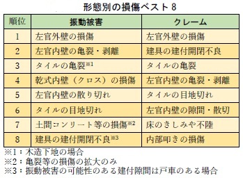 この表は、振動による損傷とクレームの多い損傷を比較したものです。