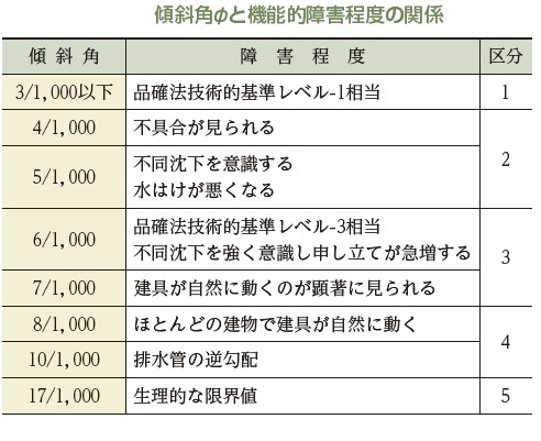 これらから、傾斜角の限界値は、下限4/1000、標準6/1000、上限8/1000と考えられます。これを不同沈下量に換算すれば長さ10m程度の建物で40㎜(下限)となります。