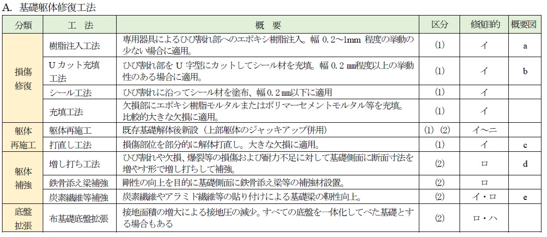 以下に示すように、不具合事象に応じた様々な修復方法がありますが、その選定にあたっては、前述のとおり、不具合の発生原因を特定し、原因に対応した修復目的を設定することが重要です。