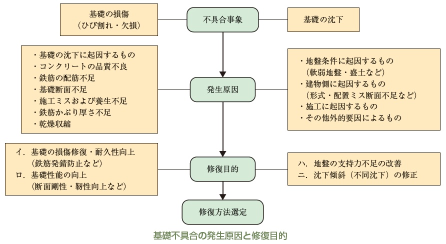 沈下被害では基礎の修復が重要となります。この図は、基礎の不具合事象別の発生原因と修復目的を示したものです。基礎の不具合は、ひび割れや欠損(以後,あわせて損傷と呼びます)と基礎の沈下に区分されますが、基礎が沈下したことにより損傷が生じるなど、実際の不具合事象は複合的な場合が多くあります。