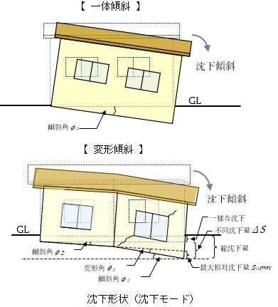 一方、変形傾斜の場合は、傾斜角と変形角が発生するため、先の使用性や機能性の問題に加え、基礎および上部構造におけるひび割れや変形など構造耐力的な問題も生じます。